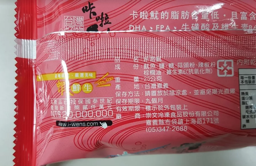 成份:魷魚、鹽、糖、棕櫚油、維生素E(抗氧化劑)。