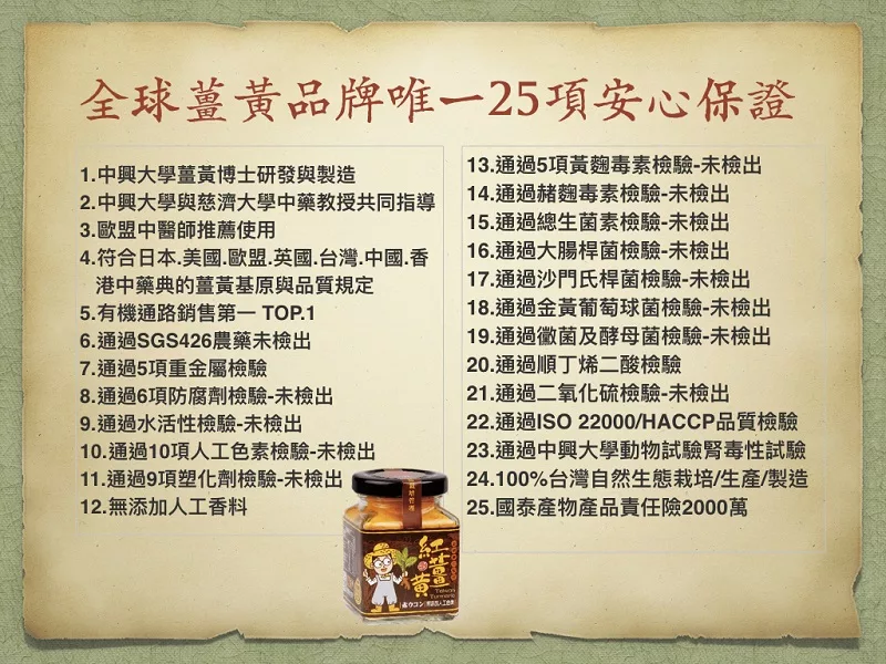 ?100%天然薑黃、老薑母與桂圓,含高量薑黃素與豐富的薑黃素、薑醇、微量元素等成份