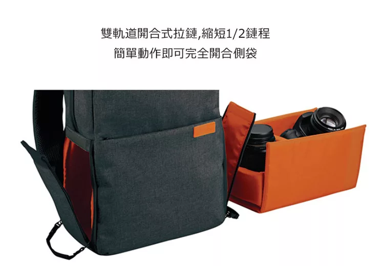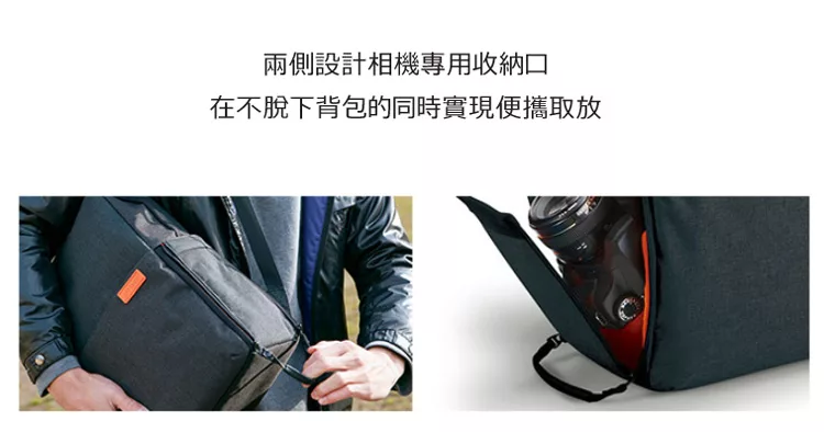 █包包兩側下半部設有內裝相機內袋的相機專用收納口,包包背著也可從兩側取出收納相機。