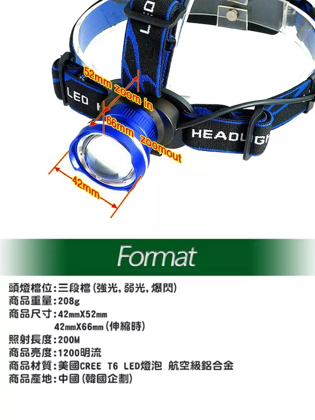 【韓國SELPA】T6LED伸縮變焦鋁合金頭燈