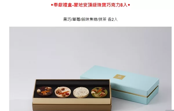 商品推薦:《COURONNE法式珠寶甜點》奉獻禮盒-蒙地安頂級珠寶巧克力8入(口味隨機出貨)